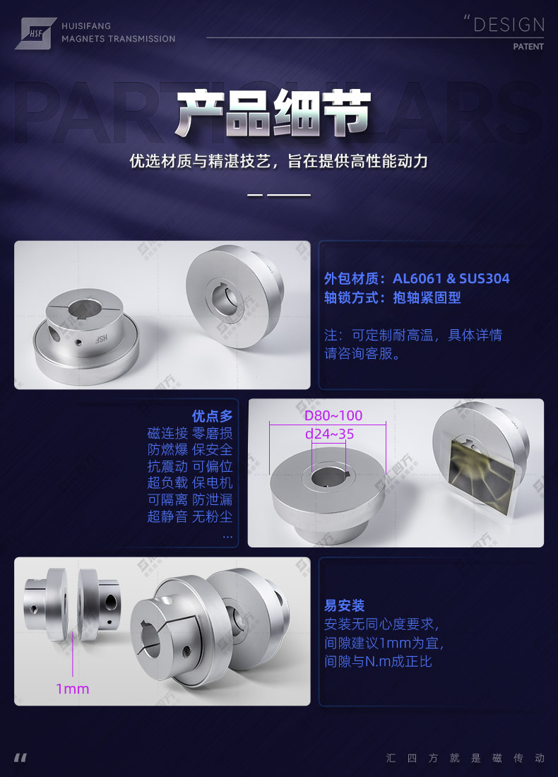 磁力聯(lián)軸器(Magnet Coupling),特別適用于中低速正反轉(zhuǎn)的輕型設(shè)備, 磁力聯(lián)軸器屬于非接觸式動力傳遞裝置。 目前在核電、 航天航空、 生物醫(yī)療、海洋裝備、石油化工、實(shí)驗(yàn)室真空等設(shè)備都有著廣泛的應(yīng)用。