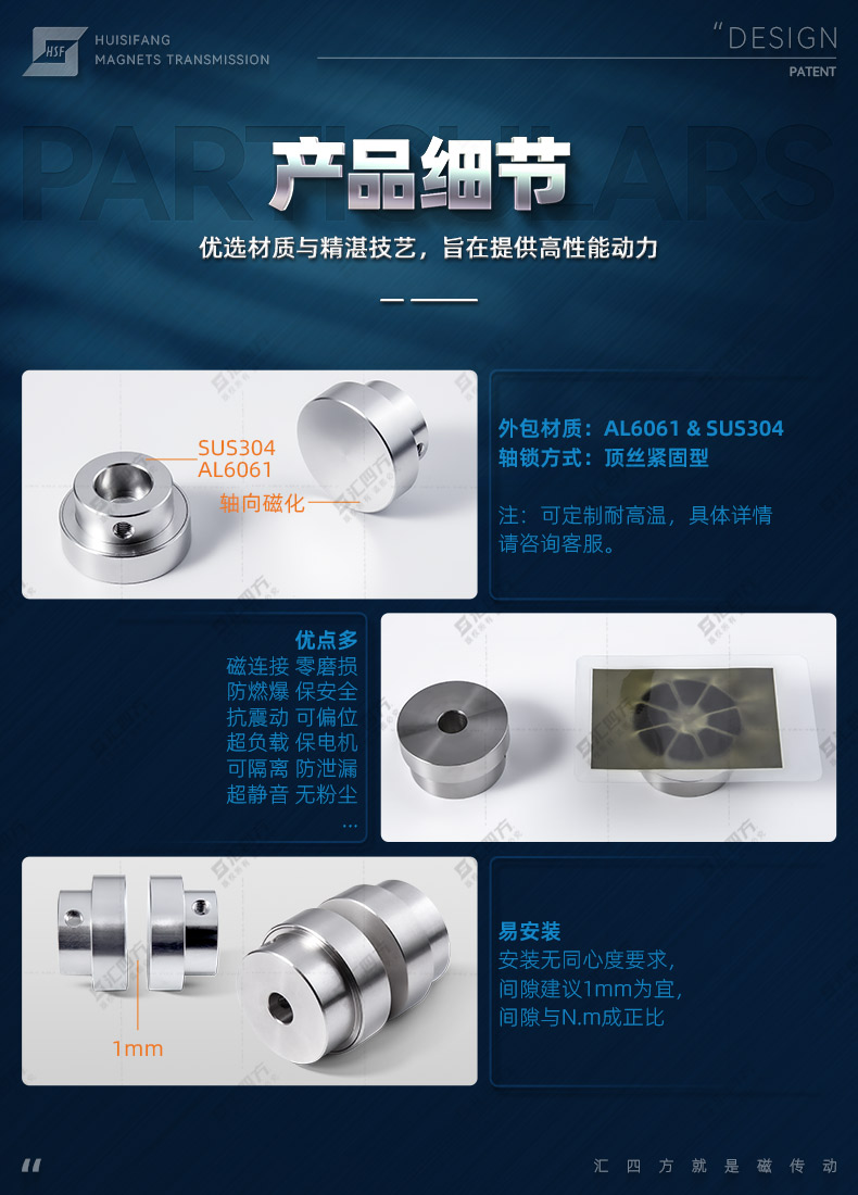 平面磁力聯(lián)軸器(Planar Magnetic Coupling)扭矩之內(nèi)同步傳動,可偏心不同軸,無需開孔,中間可以隔離非導(dǎo)磁材質(zhì)實現(xiàn)無接觸傳動。具備被動端過載自動分離功能,保護(hù)電機(jī)主動端正常工作。其次,在一些需要隨時脫離再耦合的旋轉(zhuǎn)工作臺,解決了需要經(jīng)常拆機(jī)的繁瑣工作。目前在智能裝備、 航天航空、 生物醫(yī)療、海洋裝備、實驗室真空等設(shè)備也有著廣泛的應(yīng)用。