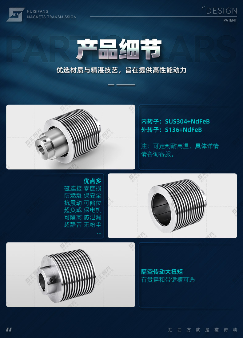 徑向磁力聯(lián)軸器(Radial Magnetic Coupling)內(nèi)轉(zhuǎn)與外轉(zhuǎn)子的中間安裝靜態(tài)法蘭隔離罩,無接觸傳動。特別適用于中速、低速、高速輕型設(shè)備,適合正反轉(zhuǎn)傳動。防止泄漏,避免發(fā)生安全事故,減少維護和停工更換成本。在核電、 航天航空、 生物醫(yī)療、海洋裝備、石油化工、實驗室真空等設(shè)備都有著廣泛的應(yīng)用。