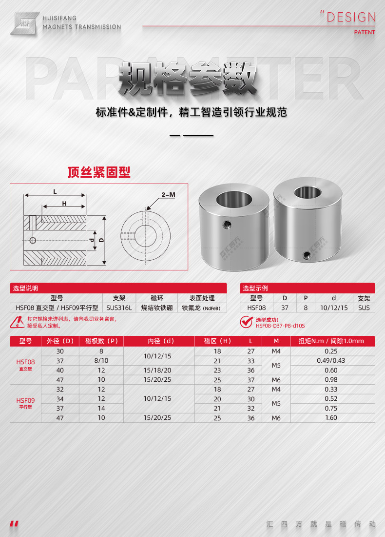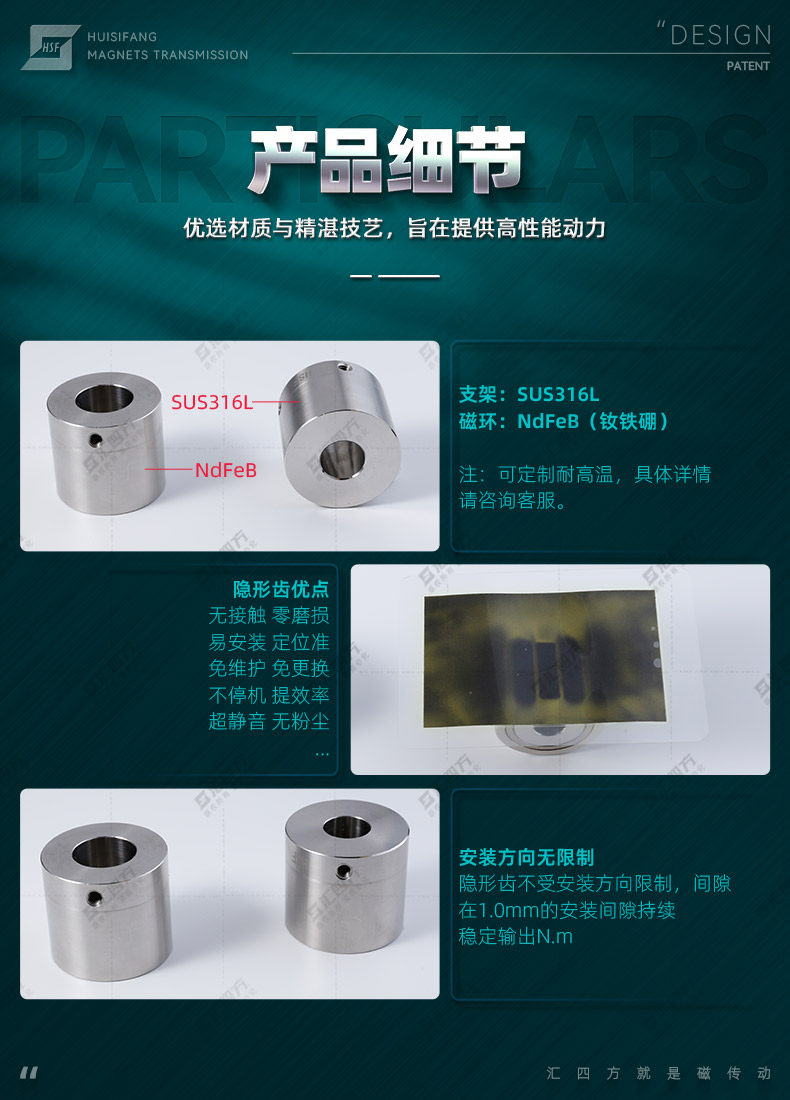 磁力輪(Magnet Gear)是利用釹鐵硼強(qiáng)鐵的吸力和斥力的相互作用原理,實(shí)現(xiàn)無接觸的動(dòng)力傳遞裝置。SUS316L耐酸堿液體、氣體腐蝕。